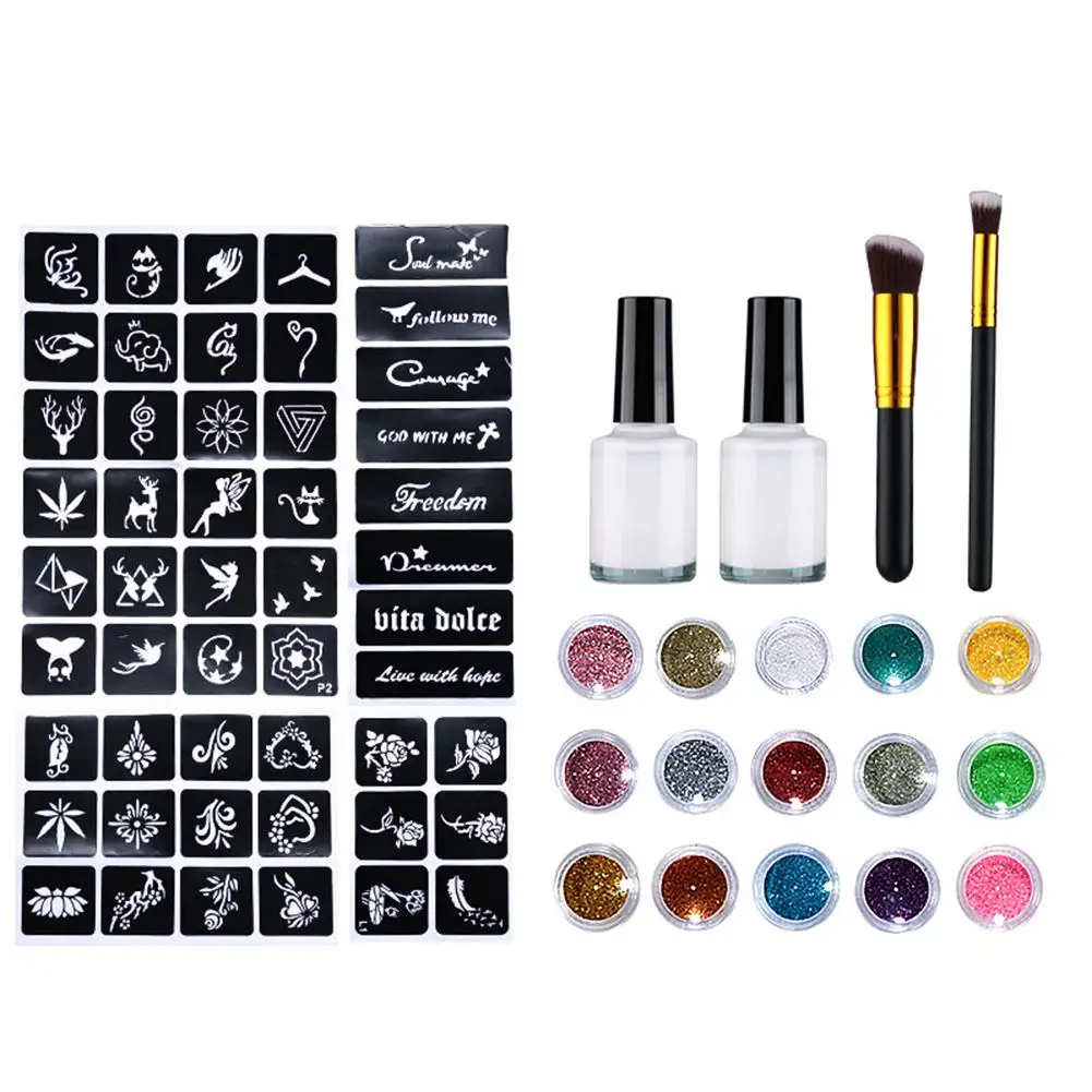 15 Colors Templates Flash Diamond Glitter Shine Flash Powder For Body Temporary Tattoo Kids Adult Face Painting Art Tools Suit