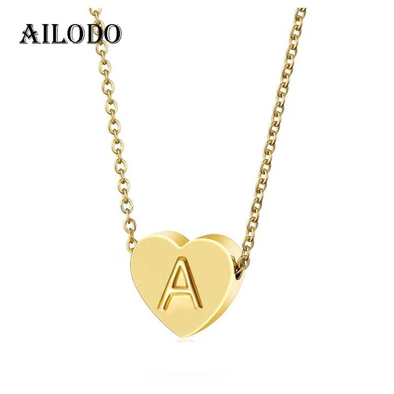 Ailodo Fashion Tiny Heart Initial Necklace Stainless Steel Gold Color Letter Name Necklace For Women Pendant Jewelry Girls Gift